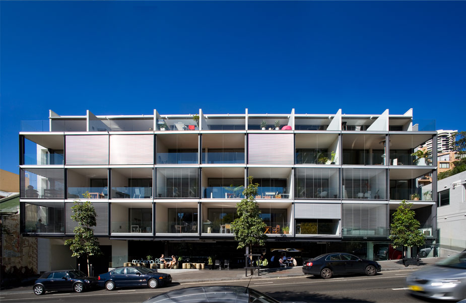 The building character is enhanced through the use of ‘Basalt’ steel fluted panels and glass technology (clear, tinted and translucent glass) that regularise the exterior appearance of the building, respond to orientation and create a strong vertical proportion of narrow solid panels and windows. The building has a layered facade comprising a central solid form of grooved insitu concrete that is ‘sandwiched’ by a deep lightweight veneer comprising steel panels, steel PFC to slab edges and frameless glass screens and windows that enliven the street elevations and create fine grain detail. The interplay of the solid form and the lightweight elements create a distinct and unifying expression to the building. A deep recess in the built form to Kippax Street achieves a comfortable relationship with the existing warehouse to the north and relieves the long street wall above Level 1. The street interface to Kippax Street maximises street activation with full height steel framed windows and glazed white brickwork. Due to the steeply sloping topography, the entry to the shop is a small forecourt that is marked with an integrated brick signpost that sits within the peculiar boundary alignment. The regularised elevation to Sophia Street has been disrupted with a metal palisade fence at Level 4 to maximise outlook from the communal open spaces over the rooftops of buildings opposite the site. The ‘frame’ unifies the elevation composition and provides shade to the communal open space. A narrow awning with steel PFC fascia defines the base of the frame and separates the different uses and entry lobby. The base of the building is composed of glazed white brickwork, glass and aluminium roller shutter.