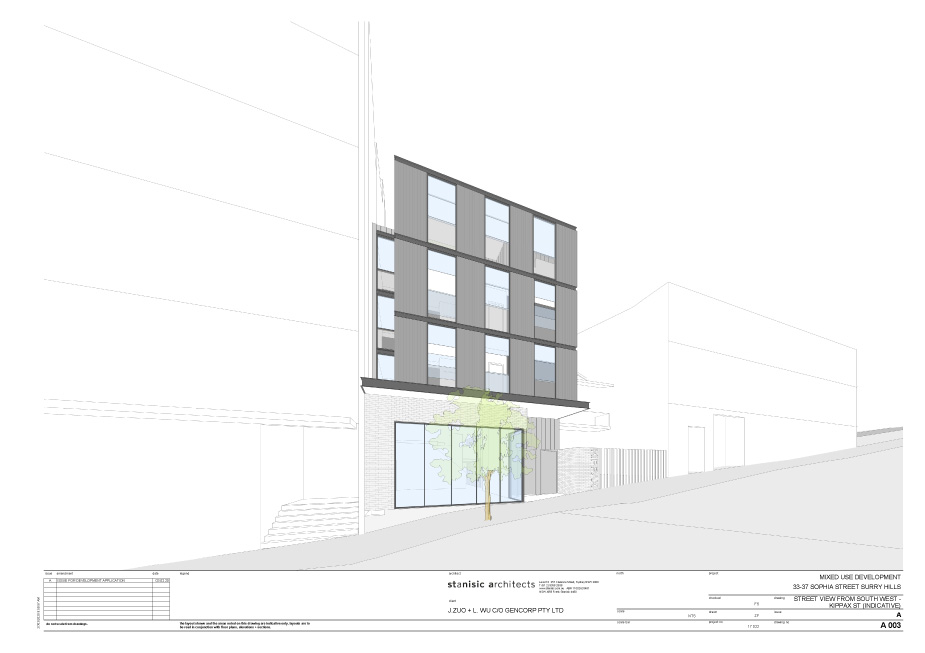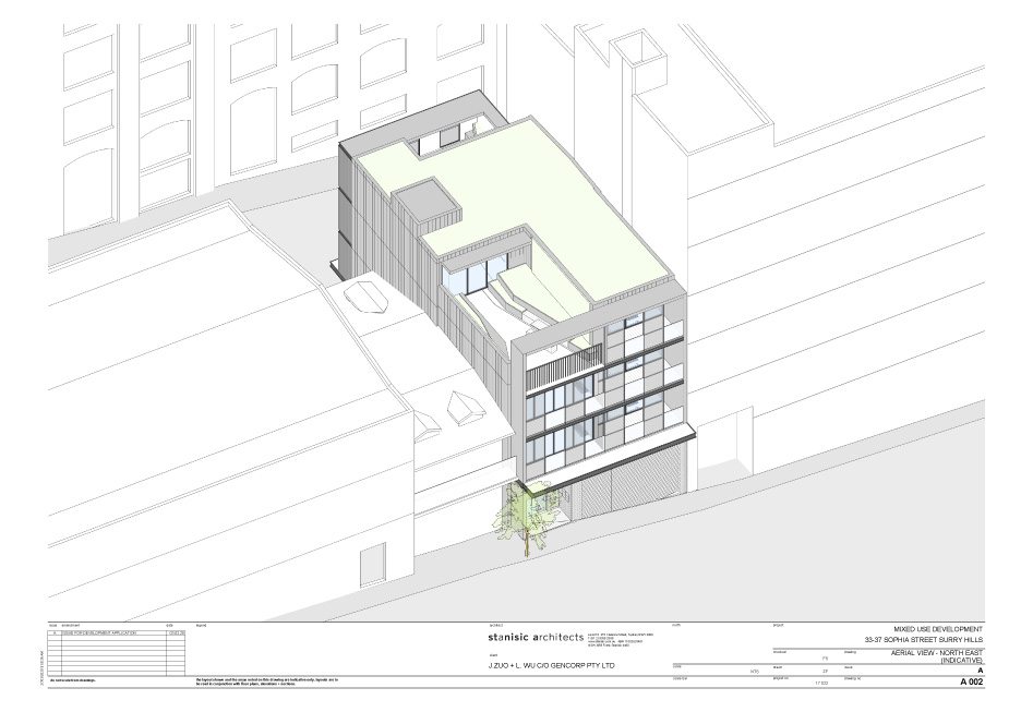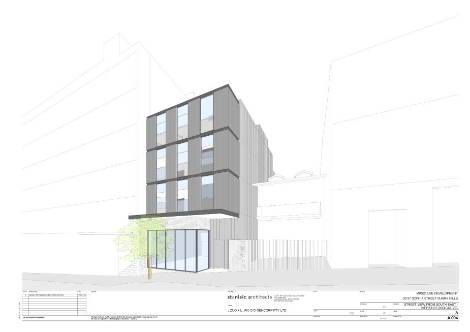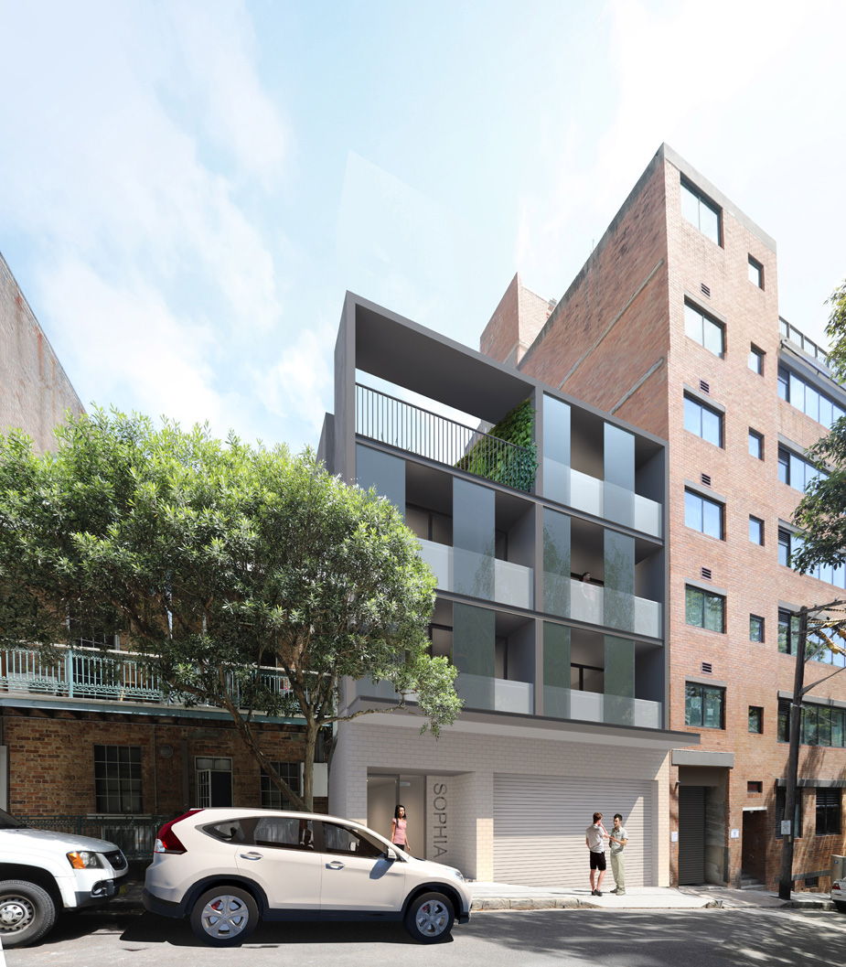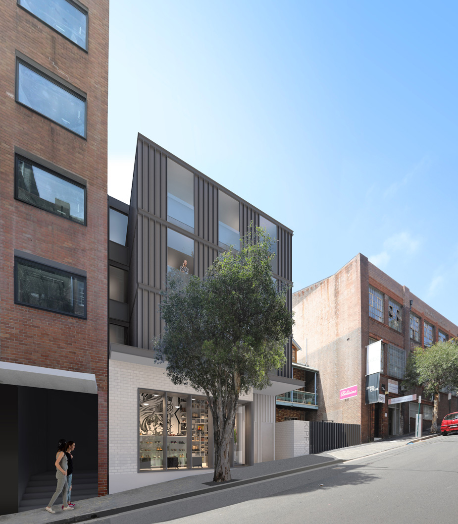 The design concept for the project is a contemporary infill, mixed use development within an established urban setting that is built to the dual street alignment and engages with the street. The external expression has been skilfully designed to relate to the surrounding existing context and clearly distinguish between the different uses within a unified composition. Kippax Street is activated with a large shop at Level 1 (Ground) Sophia Street with an entry lobby and loading dock entry. Both street frontages have narrow awnings to emphasise the base and top of the building while providing shade and weather protection. The roof of the building is punctuated with two small communal open spaces that are open to the sky, comprising passive communal areas, seating and planting in planter boxes and on green walls. The south facing communal open space to Kippax Street is concealed behind the façade, maintaining the rhythm of glass and steel fluted panels. The large opening is cut into the roof slab above this space to maintain the integrity of the form. The north facing communal open space to Sophia Street is expressed as an interruption in the framed façade behind a metal palisade screen. This space has an outlook over the ridge of the neighbouring buildings on the northern side of Sophia Street that are only 2 storeys in height. The facades to Sophia and Kippax Streets incorporate narrow windows and solid panels at Level 2 and above to create a vertical proportion that relates to the adjoining terrace houses and adjoining warehouses.