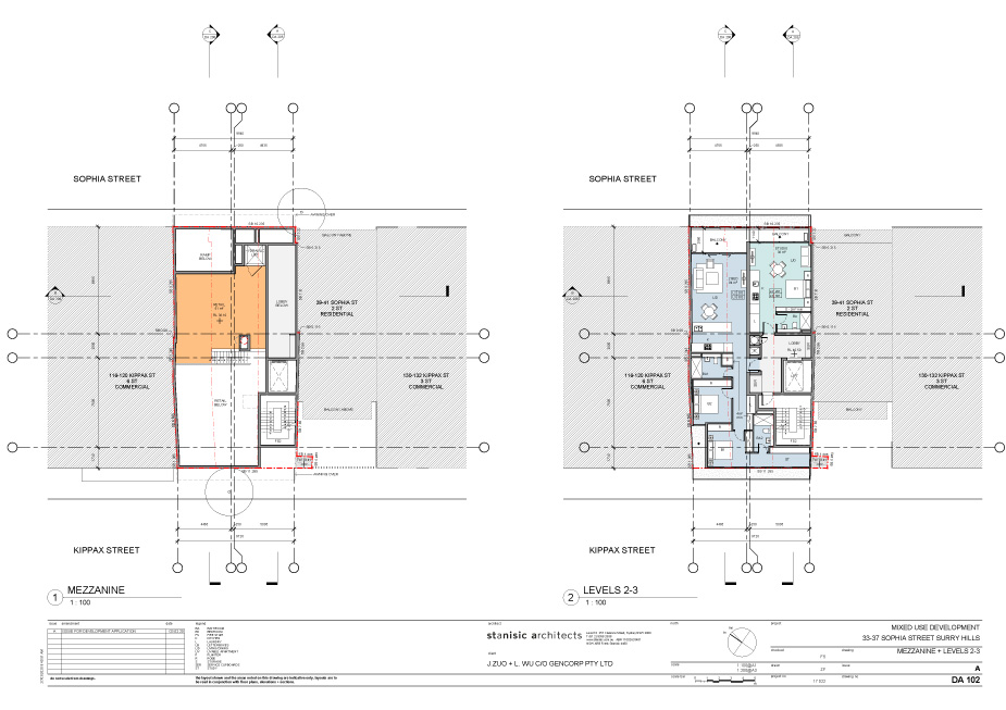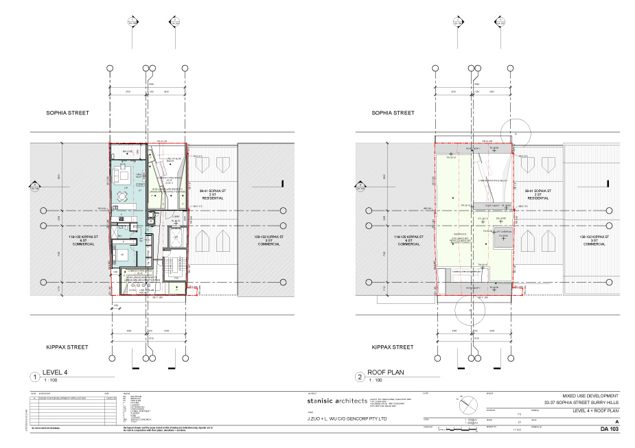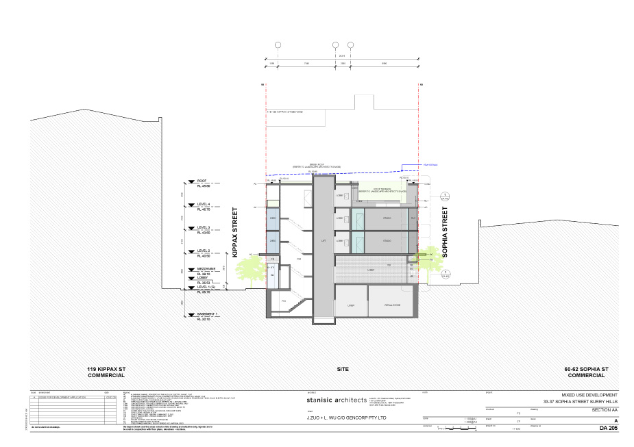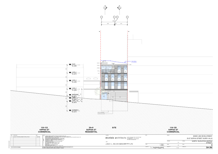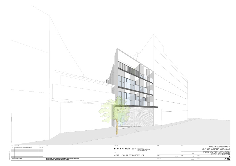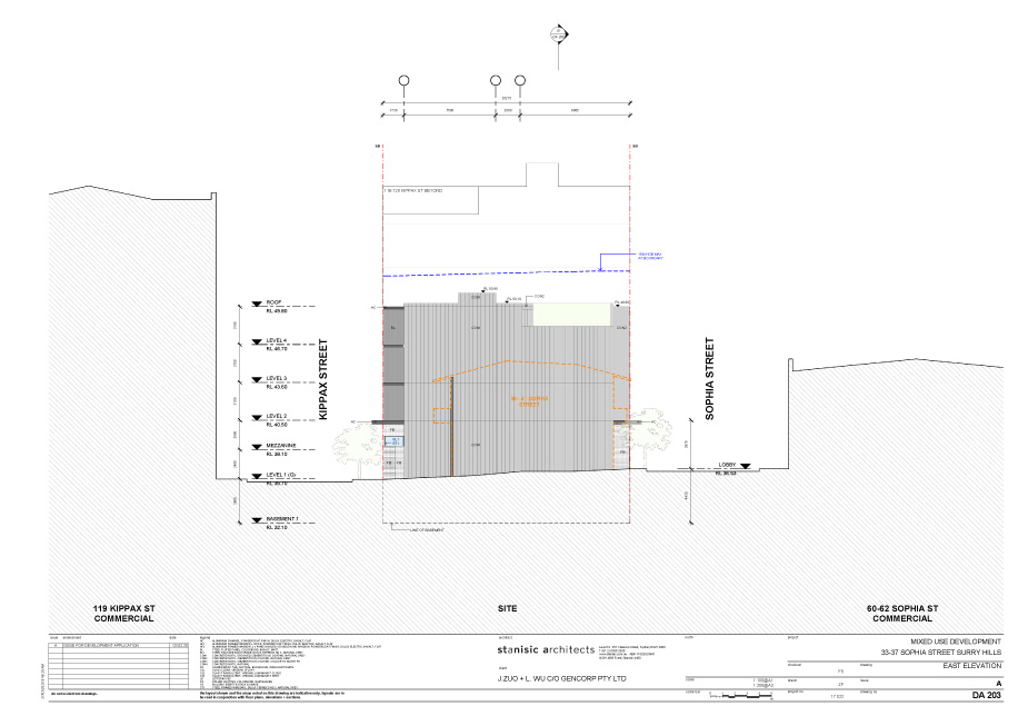 The design concept for the project is a contemporary infill, mixed use development within an established urban setting that is built to the dual street alignment and engages with the street. The external expression has been skilfully designed to relate to the surrounding existing context and clearly distinguish between the different uses within a unified composition. Kippax Street is activated with a large shop at Level 1 (Ground) Sophia Street with an entry lobby and loading dock entry. Both street frontages have narrow awnings to emphasise the base and top of the building while providing shade and weather protection. The roof of the building is punctuated with two small communal open spaces that are open to the sky, comprising passive communal areas, seating and planting in planter boxes and on green walls. The south facing communal open space to Kippax Street is concealed behind the façade, maintaining the rhythm of glass and steel fluted panels. The large opening is cut into the roof slab above this space to maintain the integrity of the form. The north facing communal open space to Sophia Street is expressed as an interruption in the framed façade behind a metal palisade screen. This space has an outlook over the ridge of the neighbouring buildings on the northern side of Sophia Street that are only 2 storeys in height. The facades to Sophia and Kippax Streets incorporate narrow windows and solid panels at Level 2 and above to create a vertical proportion that relates to the adjoining terrace houses and adjoining warehouses.