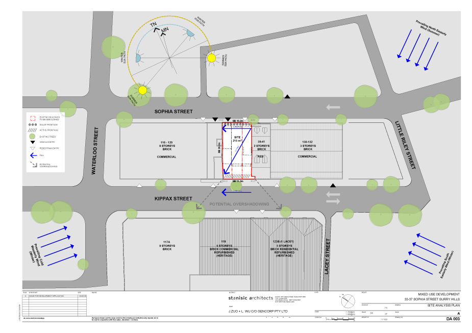 Sophia Street is a minor, single lane street that extends from Terry Street near Elizabeth Street to the west and to Riley Street to the east. It has two clearly defined characters, delineated by Waterloo Street. Sophia Street (west) to the west of the site, primarily serves as a service lane, with narrow carriageway and 600mm wide footpaths, providing access to carparking as well as loading docks for waste collection. Sophia Street (east), where the subject site is located, has a markedly different character, with wider carriageway comprising parking on the south side and 1-1.5m wide footpaths. This section of the street has a diverse range of uses including retail, offices and residential in the form of terrace houses. The street also contains street trees spaced wide apart that range in height from 3-4 storeys. Kippax Street is a primary street that extends from Elizabeth Street to Little Riley Street. It is characterised by a two-way carriageway and parking on both sides of the street. There are a range of uses including retail, offices and residential built to the street boundary with active uses at the ground level.