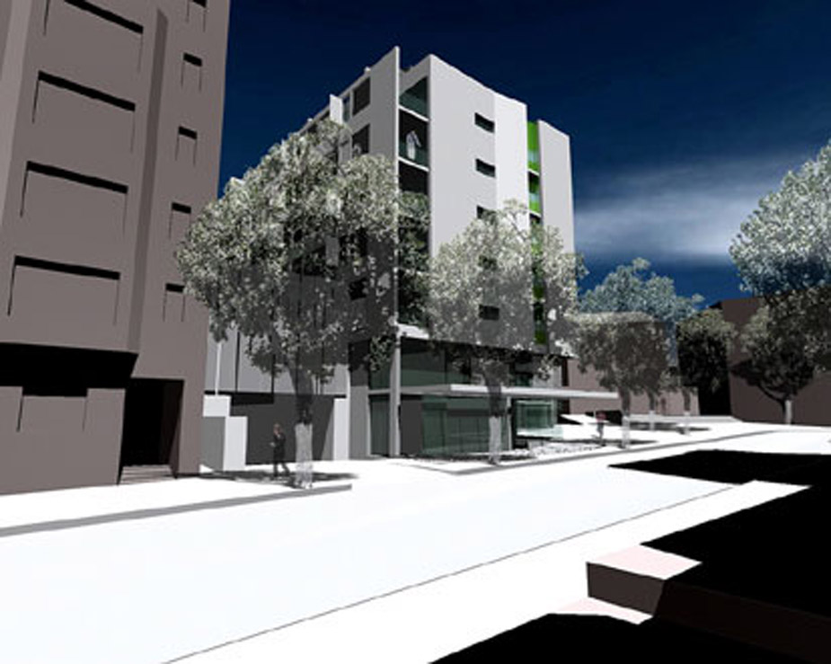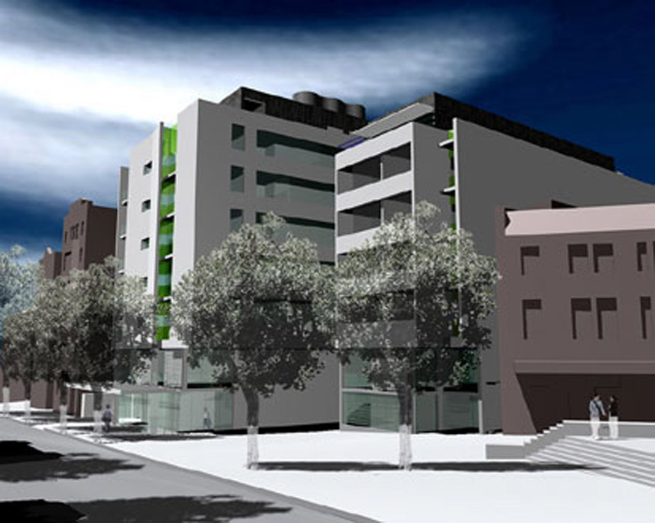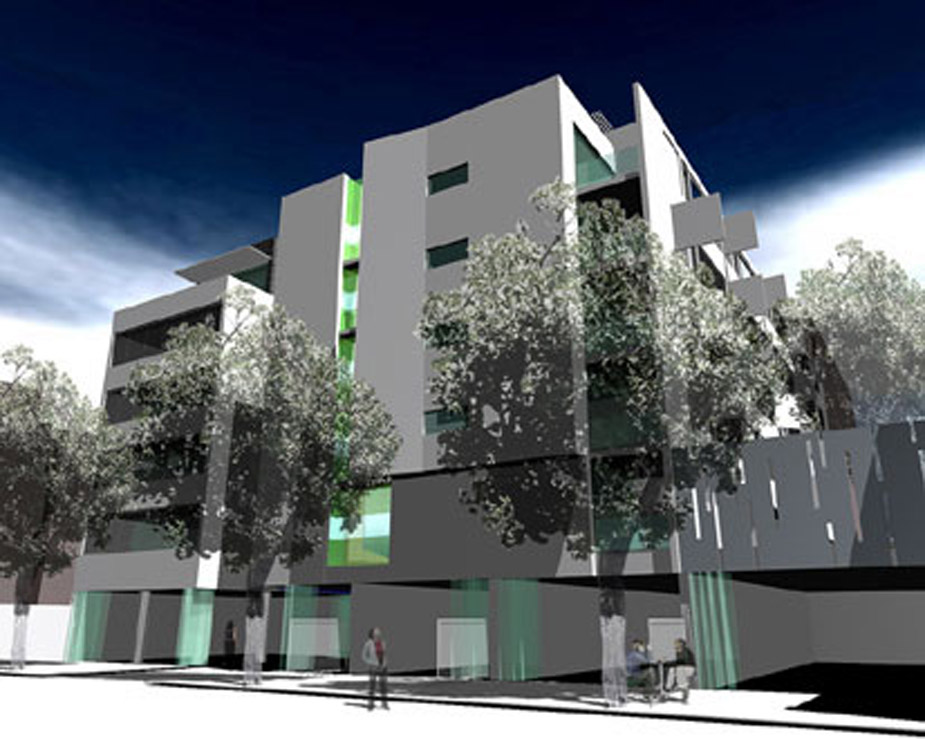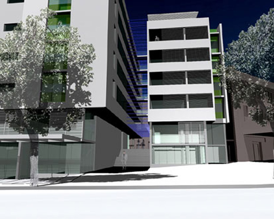 65 apartments and 5 shops; corner, block edge building facing north and west, raised communal courtyard. 9 storey height with central corridors and 2 lift and stair cores. 3 level basement carpark. 1 …