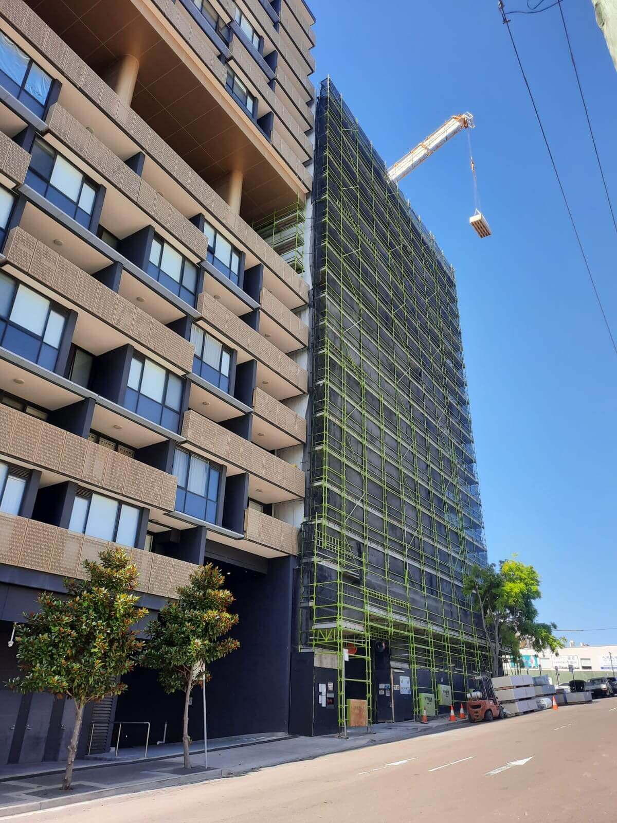 Treacy Street West is a hybrid form that is an extension of the distinctive aesthetic of the adjoining Centre and West stages known as Imperial. The external expression emphasises its dual orientation: the sunny north to the Hurstville City Centre and the cooler south to Kogarah. The street elevation to Treacy Street is fitted with a perforated, metal ‘jacket’ that is placed over balconies. The ‘jacket’ is a second skin, an environmental filter that screens the living areas from the hot sun in summer and reduced heat loss in winter.