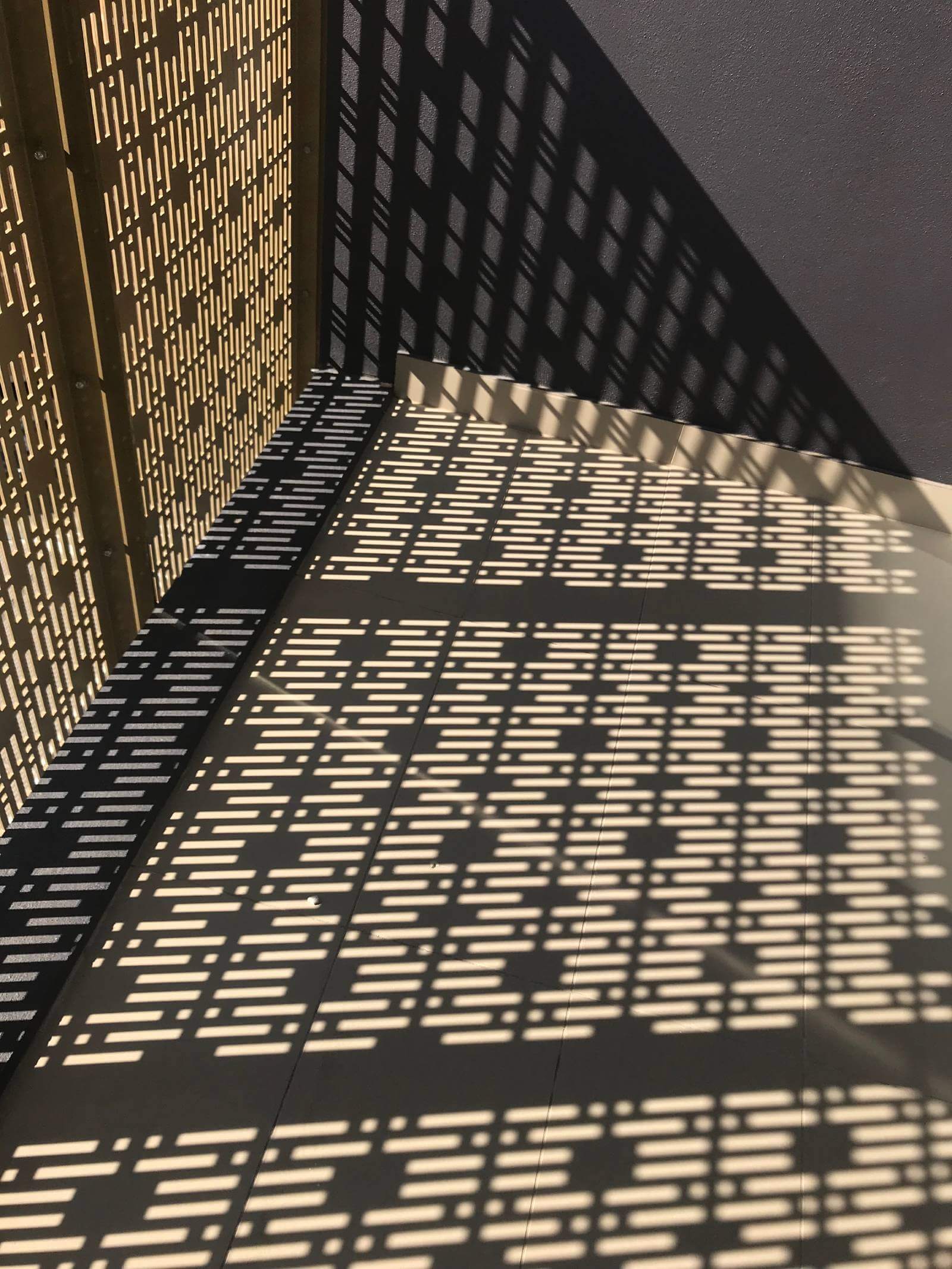 Perforated aluminium balustrade panels to the noth have a ‘golden’ powedercoated finish that amplify the golden rays of the sun. Fibre cement panels to the south have a metallic silver and bronze paint finish.